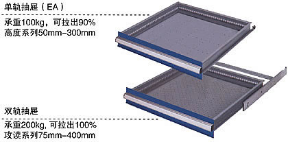工具櫃抽屜特殊滑軌設計,並用軸(zhóu)承滑動,載重進出輕盈順暢.  單軌抽屜打開率90%,每(měi)層(céng)抽屜平均(jun1)載(zǎi)重(chóng)80-100kg. 雙軌抽屜100%可打開,每層抽屜平均載重160-200kg.